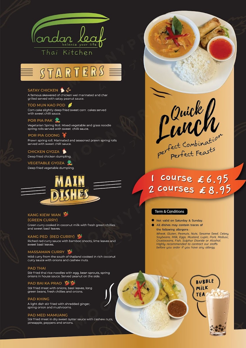 The menu at Pandan Leaf offers a vibrant selection of Thai-inspired dishes that cater to a variety of tastes. For starters, guests can indulge in the Pandan Leaf Mixed Platter or the Pandan Leaf Mixed Vegetarian Platter, perfect for sharing, alongside crispy delights like Vegetable Tempura and Satay Chicken. Soup lovers can enjoy the classic Tom Yam Chicken Soup or opt for the rich Tom Kha Prawn Soup, among others. For a refreshing bite, the menu includes salads such as Som Tom Salad and Larb Gai Salad, each packed with bold flavors. The Thai curry section boasts hearty options like the Special Mussaman Lamb and the fragrant Green Curry Sauce, with a variety of proteins available to complement them. Stir-fry dishes, such as Chicken Pad Num Mon Hoy and Prawn Pad Num Mon Hoy, provide savory combinations of meats and vegetables, while the grilled and seafood offerings, including Goong Yai Makahm and Goong Ob Woon Sen, bring grilled perfection to the table. For noodle enthusiasts, Chicken Pad Thai and Beef Pad Thai offer satisfying, flavorful dishes, complemented by unique sides like Coconut Rice and Sticky Rice. The vegetable options, such as Pad Aubergine and Tao Fu Bai Kra Praw, add a vibrant touch to the menu, and the Chefs Recommended Dishes include exceptional selections like Goong Yai Pao Chu Chee and Ped Makham. With a range of beverages from Coke to 7Up, the menu ensures every meal is well complemented.